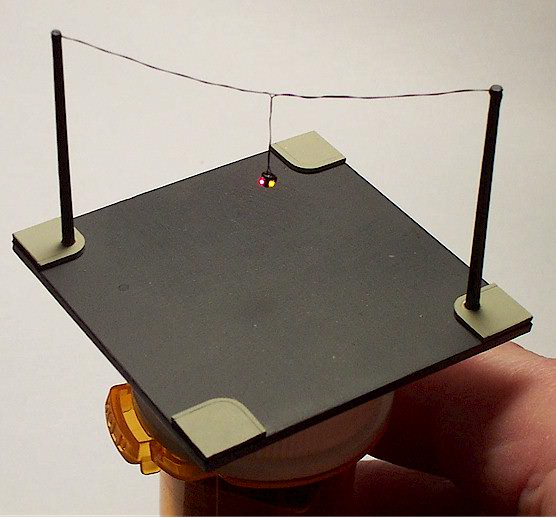 Here's an example of the .004" stainless wire between two poles to support a light over an N-scale 4-way intersection. This was using an early sample of the wire straightened to .010" straightness (we've since gone with the tightest .002" tolerance). In this example four Micro LEDs (2 red and 2 yellow) were wired in series and the two #38 leads were wound around the .004" stainless wire in opposite directions and then down slots in the poles to the flashing circuit below. The Stainless wire is attached to the poles using CA adhesive. Since the .004" stainless wire is much stronger and spring tempered, it was easy to "set" an exaggerated droop between the two poles and the #38 (copper) wires followed the droop. A light touch of Poly Scale Night Black acrylic paint and the four LEDs and associated wires resemble the real thing. © 2008 Ngineering |