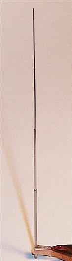 Here's a flagpole we're making using 1" lengths of our .012" stainless wire, .018" tubing, and .032" tubing, and a 3/4" length of our .042" tubing. We inserted the wire, .018" and .032" tubes into each other so 3/4" (10 N-Scale feet) protrudes and cemented them in place using a tiny droplet of ultra-thin CA adhesive. We then cemented the .042" diameter tube over the .032" tube at the 3/4' point. Next we'll cement a small drilled bead on the end of the .012" wire and airbrush the whole thing with Poly Scale Reefer White. Voila !! A very quick, absolutely smooth and straight, 40-foot flagpole.