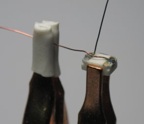 make your solder connection. Shown below is a wired 2x3 LED with the anode (+)