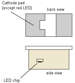 Nano details As we dig deeper into specific miniature lighting projects, the physical orientation of the LED will have a major impact on the lighting effect trying to be achieved. A Nano LED is basically a small PC board with solder pads on one side (the back) with the tiny LED die (or chip; the part that gives off the light), mounted on the other side. This chip is then enclosed in a molded "house" of epoxy for protection. When power is applied through the solder pads, the chip emits a very bright light which shines out of the face, sides and ends of its epoxy "house". The location of the LED chip is slightly offset from center toward one end in all Nano LEDs. It is offset toward the cathode solder pad end of the LED (except with the RED LED this would be the anode end). Figure 1 below shows the basic orientation.