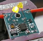 Note: Video files require time to download, please be patient. The photo below shows our N8013 Alternating Flasher in a test fixture with two yellow 20mA LEDs connected for demonstration purposes. When we build a scene or diorama using this module, we will replace this video with a more artistic representation. Click anywhere on the image to start the video. Note: This video is not enhanced or retouched.