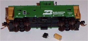 N-Scale Atlas caboose for size comparison. If the bridge terminals were folded
