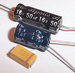 Here's an example of size comparison. In the back, a typical radial lead 50μf 16volt capacitor. In the middle, a typical "high efficiency" 47μf 16volt axial lead unit. In the front, our 100μf 16volt tantalum surface-mount style powerhouse. The added advantage of these is not only their compactness, but their "stackability" due to the typical surface-mount construction shape so widely used in reflow mass-production soldering.