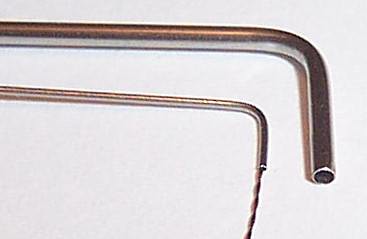 Here's a size comparison between the .018" tubing and the .050" tubing. These were both easily cold-formed as described in our bending/annealing section.