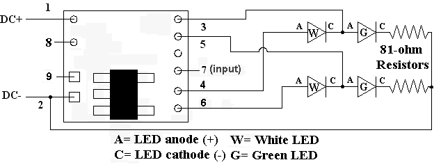 of the white LEDs. The cathode (-) of each signal-green LED is then wired to an