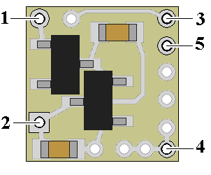 Using wire appropriate for the size of the LED and its placement in the structure, connect the first LED cathode (the –DC connection) to point 3 on the module and its anode (the +) to solder point 4. Connect the second LED cathode (-) to solder point 5, and its anode (+) to point 4. See Fig. 2 below for a layout of LED hookup.
