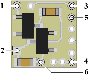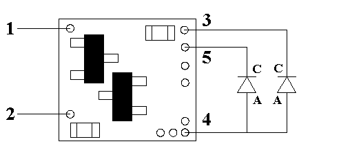 external resistor is required. Using wire appropriate for the size of the LED and its placement in the structure, connect the first LED cathode (the – connection) to point 3 on the module and its anode (the +) to solder point 4. Connect the second LED cathode (-) to solder point 5, and its anode (+) to point 4. See Fig. 2 below for a schematic layout of LED hookup.