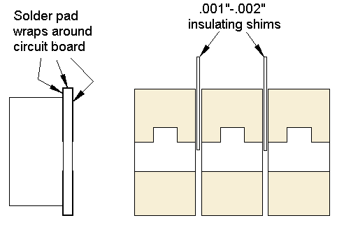 Soldering the LEDs When soldering the 3 LEDs to be used with the Super-Marslight, it is very important that they be physically located as close to each other as possible (without the cathode ends of the LEDs shorting to each other). The reason for this is so that when the Simulator is energizing the LEDs sequentially, their close proximity gives the appearance of one light source sweeping back and forth (the Marslight effect). Below in Figure 6 we show an example of 3 Nano LEDs aligned side by side. Notice the placement of a very thin shim at the cathode ends between the LEDs. There are many different materials that can be used for the shims, but the material chosen must meet certain criteria. If the shims are to be temporary (only in position during soldering), they can be any material that solder will not stick to during the soldering operation. A good choice here would be regular aluminum foil. It meets the thickness requirements at about .002" and solder will not stick to it. If the shims are to be left in place between the LEDs permanently, then they must be made of non-conductive material such as .001" or >002" Kapton tape. This material is an excellent choice because it is high-temperature material that can withstand the soldering operation and it has good insulating properties. With regard to positioning of the shims, they should be positioned to ensure total blockage of adjacent cathode conductors. Notice that the solder pads on these LEDs actually wrap around from the back (solder pad side) of the tiny circuit board to the front and go under the epoxy capsule where the LED light is emitted. This is how they make connection with the LED chip inside the capsule. When viewed on edge, this conductive circuit that wraps around extends completely to the edge (side) of the LED. If two Nano LEDs were pushed against each other, these conductors would short against each other. For this reason, we need to shim.