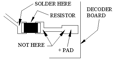 In a DCC environment, most wired decoders have a blue wire which is the common connection for all wired functions (F0, F1, etc.). It is the + DC connection and will be connected to solder point #1 as shown in Fig. 1. If the decoder is a “drop-in” style without wires, consult the decoder manual and use the blue wire supplied to connect point #1 to the appropriate + solder pad. If the solder pad has a resistor in series with it, be sure to connect the blue wire behind the resistor (see Fig. 4). This will ensure full voltage is supplied to the module.