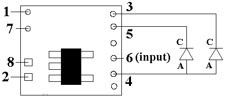 Select operating mode: The NLA/D8063 can produce its special effects in one of two ways: either as a double pantograph (dual pickup) spark effect simulator or as one for a single pantograph. Many electrics have two pickups (one at each end of the locomotive or traction vehicle), while some such as earlier-era street trolleys may only have a single spring-loaded pole which contacts the catenary cable overhead. By default, the NLA/D8063 is configured to produce spark effects on two separate LED outputs (one for each pantograph or pickup). The outputs of these 2 LEDs will be random and timed differently for each. If a single pickup (and therefore single LED) is to be used, connect a wire between solder point 6 to — DC (solder point 2). This will cause all effects to be routed for only one LED connected to solder points 3 & 4. Flicker control Another new feature we've added to our low-voltage Simulator modules is solder-points for direct wiring of external capacitors for flicker control. These are solder points 7 and 8. When connecting external capacitance for this purpose, if multiple capacitors are used, they must be wired in parallel (all + connections together, and all – connections together). They must have a voltage rating of 16-volts or greater. The + (plus) connections are to be wired to solder point 7 and the – (minus) connections wired to point 8. For this Strobe Simulator, a capacitance value of 200 to 400uf should be sufficient.