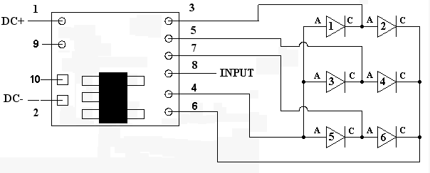 The N8049 controls the lighting of the 6 LEDs with control wires connected as follows: Solder point 3 is wired to the junction of LED 1 cathode and LED 2 anode. Solder point 5 is wired to the junction of LED 3 cathode and LED 4 anode. Solder point 7 is wired to the junction of LED 5 cathode and LED 6 anode.