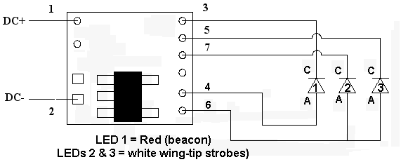 NLD8062 Navigation Simulator Effect and Installation Description of Lighting Effects This simulator is programmed to run a red LED beacon (varies in intensity to simulate rotational effect), and 2 white LEDs configured as strobes for wingtips. Timing of the beacon is approximately once per second, and after every second cycle the strobes pulse for a short 25ms burst. This mimics many tail beacons and wingtip strobes seen on WW2 and modern aircraft.