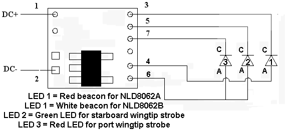 NLD8062A & NLD8062B Navigation Simulator Effect and Installation Description of Lighting Effects This simulator is programmed to run a red LED beacon (varies in intensity to simulate rotational effect), and 1 green and 1 red LED configured as strobes for wingtips for the NLD8062A, or the NLD8062B with a white LED beacon with green & red wingtip strobes. Timing of the beacon is approximately once per second, and after every second cycle the strobes pulse for a short 25ms burst. This mimics many tail beacons and wingtip strobes seen on WW2 and modern aircraft.