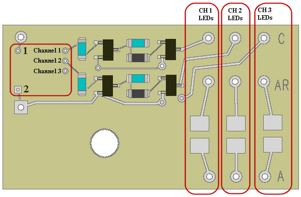 Figure 2 below, is an example of a N8103-2 (2 channel) Booster Board. Note the holes located inside the red rectangle on the left side of the board. These 5 holes match the 5 holes in a Simulator and align with them perfectly when a Simulator is positioned over them. Important note: A N8103-1 (single channel) Booster Board will always use the single hole shown next to Channel 1 for its connection point to a single output Simulator. A N8103-2 (dual or 2 channel) board will always use the 2 holes positioned next to Channels 1 & 2, and a N8103-3 (3 channel) Booster will use all 3. Unlike our Simulators, these connection points are fixed. The areas outlined in red on the right side of the Booster correspond to the connection points for LED hookup to the channels indicated. This will be covered in detail in the Connecting LEDs section below