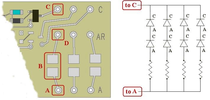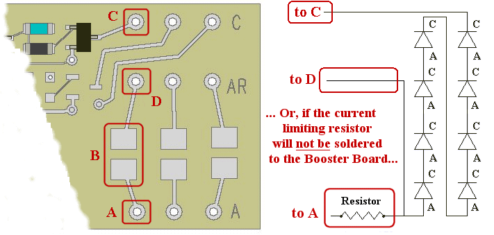 In Figure 6 above, we see the 8 LEDs connected in series. Note the red square marked C on the Booster Board. This is the cathode connection on the Booster Board and the wire coming from the cathode (C) of the last LED in the group should be soldered to it. Next, note the area on the Booster that is marked B. This is a pair of solder pads to allow placement of an on-board resistor. If the Booster Board will be connected to a series group of LEDs, this is a handy place to mount the required current limiting resistor. The pads are large enough to accommodate many different wattage resistors. If you choose to use these on-board pads for your resistor in the series group of LEDs, the anode of the first LED in the group must be connected to point D on the Booster Board. If your project is already completed of if the series group's resistor is located somewhere else (and cannot be place on the Booster Board), then the first LED's anode must be connected to point A on the Booster Board.