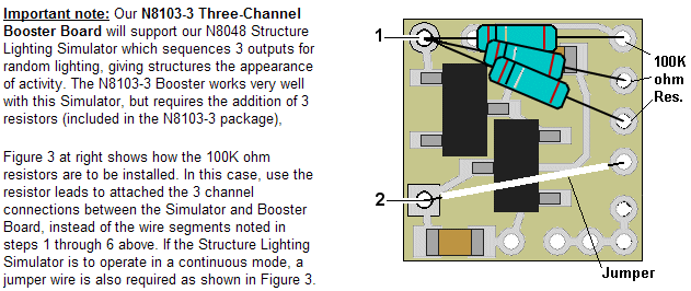 Connecting a Simulator to a Booster Board: Connecting our Simulators to a Booster Board is very straightforward. The Booster Board has solder plated holes which correspond to the power input and output holes located in our Simulators, so alignment and solder connection is very easy. A length of #26 tinned buss wire is included with each Booster Board for this purpose. Below in Figure 1 is a typical Simulator with 3 output channels. If it were a single output Simulator we would only be concerned with one output hole. Important note: Not all simulators use the same output holes. It is very important to check the instruction sheet that accompanies each Simulator product for the correct output hole location. For example, our N8034 Ditchlight Simulator uses the upper-right hole (shown below as 3) for input control of the alternating ditchlight effect. LED outputs for that simulator are the next two right-side holes (shown below as 4 and 5). If this Simulator were to be connect to an N8031-2 2-channel Booster Board shown in Figure 2, the following hookup would be performed: Hole 1 on the Simulator goes to hole 1 on the Booster Hole 2 on the Simulator goes to hole 2 on the Booster Hole 4 on the Simulator goes to the Booster channel 1 hole Hole 5 on the Simulator goes to the Booster channel 2 hole This may seem a bit confusing but it is really quite clear if you always check the product instruction to determine which point (holes are used for LED output. Note the 5 points (holes) outlined in red. These are +DC connections for LEDs and are not used when a Simulator is connected to a Booster Board. The Booster Board provides all connection points for LEDs.