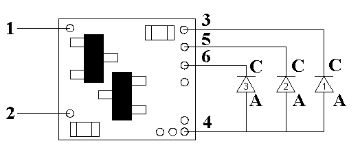 When connecting the LED, proper polarity must be observed. LEDs are “polarity sensitive” and will not function is connected backwards. The N8066 is configured to connect up to three 20 ma LEDs with device voltages of 1.85-2.2 VDC. This covers all of Ngineering’s Micro and Nano red and green LEDs, as well as many of the red and green LEDs available. Using wire appropriate for the size of the LED and its placement in the modeling project, connect the LED cathodes (the – connections) to points 3, 5 & 6 on the module, and their anodes (the +) to solder point 4. Solder point 4 is actually a group of four solder points bridged together for convenient connection of multiple wires.. See Fig. 4 below for a schematic layout of LED hookup.