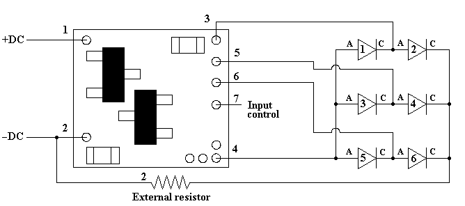 In the wiring diagram below (Fig.2), the LEDs are shown with numbers 1 through 6 for clarity and have their anode (+) and cathode(-) connections identified by A and C. Note that the six LEDs are essentially connected as 3 series-pair groups (1 to 2, 3 to 4, 5 to 6). Also note that all of the odd numbered LEDs have their anodes connected together and are then connected to the solder point 4. Further, note that all of the even numbered LEDs have their cathodes connected together and are then connected in series with an external resistor (supplied with the N8049) and then connected back to solder point 2. The N8049 controls the lighting of the 6 LEDs with control wires connected as follows: Solder point 3 is wired to the junction of LED 1 cathode and LED 2 anode. Solder point 5 is wired to the junction of LED 3 cathode and LED 4 anode. Solder point 6 is wired to the junction of LED 5 cathode and LED 6 anode.