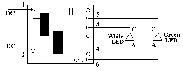 Installing the N8035 is very straightforward. Because the module has circuitry on both sides, care must be taken to be sure that the components or wires soldered will not make contact with any metal object which could cause a short circuit. Included with the module are two 6” lengths of #32 insulated wire. If necessary, these can be used for power input wires. If used, we recommend the blue wire be used for the + DC connection. It would be connected to solder point 1 as shown in Fig. 1. This wire could also connect through a switch to the + DC connection for remote control of the lighting effect. The other (green) wire should be connected to – DC and to solder point 2. Any well regulated DC power source can be used to power this module providing the voltage is at least 6VDC and doesn't exceed 18VDC. Our N3512 and N3518 Power supplies are ideal for this use. Also, due to the very low power consumption, this device can also be powered by a battery, such as a standard 9-volt. Important note: A low-wattage iron with a pointed tip should be used for connection of wires. Too much heat or solder can easily damage the wires or module and void the warranty.
