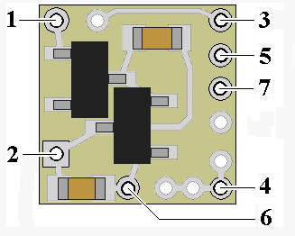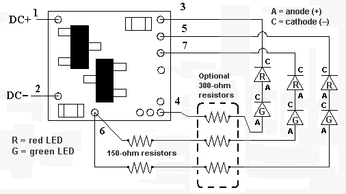 Using wire appropriate for the size of the LED and its placement in the model, connect the white LED cathode (the – connection) to point 5 on the module and its anode (the +) to solder point 6. Connect the red LED cathode (–) to solder point 3, and its anode (+) to to one side of a 150-ohm resistor, and connect the other side of that resistor to point 4 on the module. See Fig. 2 below for a schematic layout of LED hookup.The N8202 has on-board current limiting resistance to protect the first LED pair (connected to solder points 3 & 4). The second & third series pairs must be connected to resistors that are not mounted on the circuit board. These resistors (150-ohm) are included with this package (plus spares). They're marked 1500 on the component top.