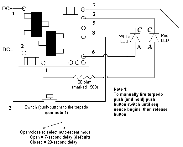 Simulator Configuration Options: 1. Manual firing with auto-repeat enabled: If auto-repeat firing of the photon torpedo is desired but manual firing is needed on demand, it is recommended that a push-button switch be wired into this circuit for easy control. Wire the push-button switch between point 2 and point 8 as shown in figure 2 (on back). To manually fire the torpedo, push and hold the push-button switch until the firing sequence starts, then release the button. In manual mode the torpedo can be fired approx. every 2 seconds. Without manually firing, the photon torpedo will auto-repeat firing at timing set by solder point 7 (see paragraph 3). 2. Manual only firing (no auto-repeat): If you intend to only manually fire the torpedo, (no auto-repeat mode), simply wire a push-button switch, into either power connection (+DC point 1, or –DC point 2) of the Simulator. Press & hold the button and the torpedo will fire after 1/4-second. Sure to hold the push-button closed for the full firing sequence, otherwise the Simulator will lose power and the sequence will stop short. 3. Automatic firing mode: As mentioned in the previous paragraph, the default mode for the N8091 (without manually firing) is auto-repeat firing once every 7 seconds. An alternate auto-repeat mode is to have the torpedo fire once every 20 seconds. To set this timing sequence, connect a wire from solder point 7 to point 2 (DC–). For additional flexibility a switch could be wired between point 7 and point 2. This would allow either auto-repeat timing sequence to be selected.