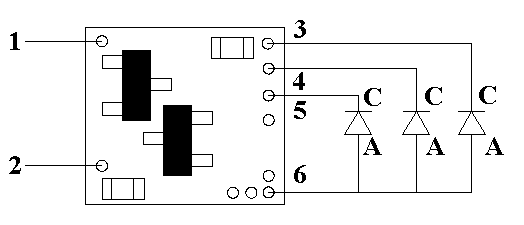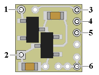 Installing the N8042 is very straightforward. Its tiny size and thin construction will allow it to be placed in many spaces too small for even the smallest Z-scale decoder. Because the module has circuitry on both sides, care must be taken to be sure that the components or wires soldered will not make contact with any metal object (such as a locomotive frame) causing a short circuit. If the N8042 is to be used in a stationary (not track powered) application, it can also be powered by any well-filtered and regulated DC power source with an output of 6-18VDC. Included with the module are two 6” lengths of #32 insulated wire. If necessary, these can be used for power input wires. Most wired decoders have a blue wire which is the common connection for all wired functions (F0, F1, etc.). It is the + DC connection and will be connected to solder point #1 as shown in Fig. 1. If the decoder is a “drop-in” style without wires, consult the decoder manual and use the blue wire supplied to connect point #1 to the appropriate + solder pad.