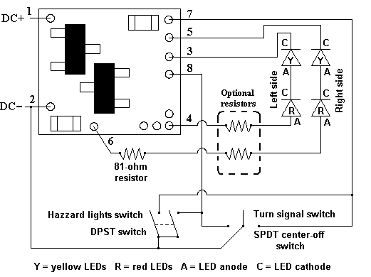 Choosing switches to control operations: Turn Signals: Shown in figure 2 below are electrical symbols for two types of switches that should be used for easy control of the turn signal and hazard functions. Vehicle turn signals are typically controlled by a 3-position switch. This switch is a SPDT center-off type (Single-Pole, Double-Throw). The wiper (or common terminal) is connected to DC –. Each one of the other terminals is connected to points 7 and 8. Switching from center-off to either position will activate that input function. If a SPDT type toggle switch is not available, a DTDP (Double-Pole, Double-Throw) type can be substituted, just make sure it has the center-off position. In this case, you would only be using one-half of the switch. Hazard Flashers: The hazard flasher is activated by connecting both points 7 & 8 to DC– (point 2)at the same time. The easiest way to do this is using a DPDT switch that does not have a center-off position. One side of the double-pole switch is left un-connected and the two wiper pins (commons) are wired together and connected to DC–. Points 7 and 8 are each connected to one of the other two poles (pins) This way, when the switch is thrown, the common wipers connect points 7 & 8 to DC– at the same time. This is essentially the way automotive manufactures control these operations, except those hazard switches are usually DPDT push-button types. LED brightness: Included with this module are two 150-ohm resistors (marked 1500) plus a spare, and two 510-ohm resistors (marked 5100) plus a spare. As shown in figure 2 below, these can be added in series with the wires from the RED LED anodes to increase the amount of resistance and lower brightness of the connected LED pairs. We’ve included the two different values so you have a choice of the amount of dimming (if any) is needed. In any case, make sure the right side red LED anode is wired with the included 81-ohm resistor to point 6. Failure to include this resistor will permanently damage the right side LEDs.