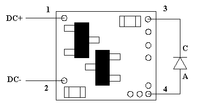 Installing the N8067 is very straightforward. Because the module has circuitry on both sides, care must be taken to be sure that the components or wires soldered will not make contact with any metal object which could cause a short circuit. Included with the module are two 6” lengths of #32 insulated wire. If necessary, these can be used for power input wires. If used, we recommend the red wire be used for the + DC connection. It would be connected to solder point 1 as shown in Fig. 1. This wire could also connect through a switch to the + DC connection for remote control of the lighting effect. The other (black) wire should be connected to – DC and to solder point 2. Any well regulated DC power source can be used to power this module providing the voltage is at least 6VDC and doesn't exceed 18VDC. Our N3512 and N3518 Power supplies are ideal for this use. Also, due to the very low power consumption, this device can also be powered by a battery, such as a standard 9-volt. Important note: A low-wattage iron with a pointed tip should be used for connection of wires. Too much heat or solder can easily damage the wires or module and void the warranty.