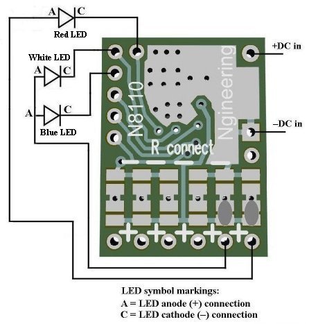 between pads. For best success in soldering the wires, place each wire into the appropriate solder hole and seat the insulation up against the hole on the front side of the board. Ensure the wire is held in that position when applying any flux and solder to the hole on the back side of the board. It is easiest if a small amount of solder is placed on the soldering iron tip first, then the wire is placed in position and flux is applied at the back side of the hole. While holding the wire in position, touch the tinned wire strand and the hole with the soldering iron tip allowing the solder to flow into the hole capturing the wire. This soldering process should only take about 1/3 of a second to provide a clean shiny solder joint with no excessive solder. Then, carefully snip the protruding wire from the solder joint. This will ensure a good joint and eliminate possible shorting. Repeat this process for all remaining wires. Soldering the LED wires to the module requires the same care as outlined above. If the LED wires are single-strand magnet wires, ensure they are properly stripped and pre-tinned prior to soldering them in place. 4- Testing and mounting the assembly: The N8110-12 Simulator assembly is now completed and should be tested prior to installation. Figure 2 below shows a schematic view of LED connections. NOTE: This module DOES NOT HAVE reverse polarity power protection, so be extra careful when connecting the +DC RED wire and the –DC BLACK wire to your power source. Connecting the backwards will damage the module.