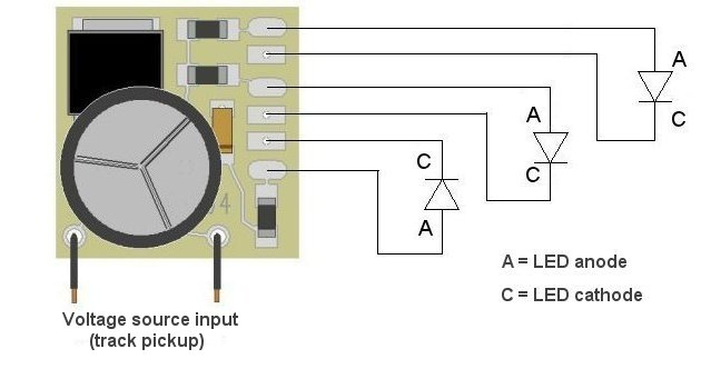 Wiring the N8104 is very straightforward. The two #32 black power input wires are connected to any voltage source (DC or DCC) with a maximum not exceeding 25-volts, or 14.5 volts AC. In the case of DC, polarity of the connections is unimportant. Figure 1 below shows the correct connection for up to 3 LEDs wired to the board. Note: LEDs are polarity sensitive devices and must be wired with their anodes (+), and cathodes (–) connected as shown.