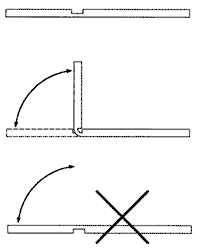 Study any instructions before you start, they are there to provide assistance. Study the fret itself and think through your assembly procedures. The brass frets are, of course, much softer and easier to cut and bend than the stainless steel frets. As a result, the brass parts are also much easier to damage. Take your time, make sure you're comfortable and your arms and hands are well supported. You'll find that etched parts are just as easy to work with as parts in plastic or wood kits. When cutting parts from a fret, always cut the thinnest connecting point first, and continue progressively so the thickest section is cut last. This helps minimize distortion of the part being removed. Etched parts can have sharp edges so handle them and their fret with this in mind. If you will be removing two or more parts from a fret, it's a good idea to have a shallow container to put the in temporarily, as they're removed. A glass Petri-dish is a good choice and they are available with covers. Bending and forming thin etched parts requires care and clean tools. Many parts may have an etched groove along the part intended to aid in the bending process. In this case, always bend the part into the groove, not away from it. (see Figure 1). ![]() Figure 1 Bonding Nearly any adhesive will work with etched materials, but what you're building, is likely to determine the choice. The all-around most popular choice is CA (Cyanoacrylate). That's because it's fairly strong and very quick setting. You only need to hold parts in position for a few seconds to get a bond. This make assembly much quicker. 5-minute epoxy is also a good choice as it will give a much stronger bond, but requires a holding fixture or clamping during the curing process. Soldering has been used on brass, copper and phosphor bronze etched materials for years. It provides a very permanent joint, but the process requires cleaning and can cause distortion. Soldering is normally reserved for larger parts. For very small parts that will ultimately be painted, here's a neat trick we learned from Scale Link, Ltd., of England; Let the paint itself be the adhesive. After the paint dries there will essentially be no (possibly ugly) glue joint and the part will be held firmly in place. Clever. Painting Since etched parts themselves are metal, any type of paint is acceptable. However, since various types of adhesives may be used and the etched parts will likely be bonded to different materials, these things will ultimately determine what is appropriate. The "least offensive" are the acrylics and latex paints because they are water based and don't contain some of the solvents that aggressively attack materials. Spraying (whether spray can or airbrush) produces the smoothest results, while brushing is most appropriate for small parts. The most important considerations are clean (oil-free) parts, good ventilation, and patience. When you form an etched part, remember that the material they're made from, (brass, stainless steel, phosphor bronze, or whatever), is of high purity and not dead-soft. There will be "spring-back" requiring you to over-bend to achieve the shape you want. This applies to angled bends, curves, and other complex shapes. As you work with etched parts you will develop a "feel" for how they behave when being formed. The important thing to remember is, have a gentle touch and patience. Try to minimize the amount of rebending you do to achieve the shape you want. If you bend a part in exactly the same place repeatedly (especially bending and reverse bending) a process called "work-hardening" occurs. Work-hardening is an effect that happens at the molecular level during bending that increases hardness of the material toward being brittle. This is because as you bend, one side of the material is being stretched, while the other is being compressed. This process damages the molecular uniformity (or grain) of the material causing it to breakdown. When we score and snap styrene, we're using work hardening to our advantage.