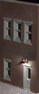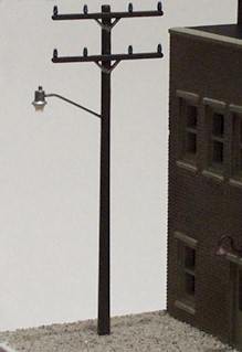 Another very common sight throughout the US is the streetlight/security light seen below. This style fixture has been around since the early 1950s and typically uses either a mercury-vapor, or sodium-vapor bulb. The sodium-vapor bulb produces light with an orangish tint. These lights can be found in commercial, industrial, and residential locations and are mounted on poles, buildings, garages, and nearly anything that will hold a mounting bracket. Look out your window tonight and you can probably count 10 to 20 of either or both colors shining within your view. We mounted our example to an Atlas N-Scale telephone pole. It uses our Micro Super-white LED and our .018" tubing. We drilled the pole at an angle for the tubing, slotted the backside of the pole down it's length with a very thin (.005") saw, then ran our #38 wire down in the slot and out the bottom of the pole. We filled the slot with a thinned mixture of Delta Ceramcoat artist's gesso and lightly sanded it after it dried. After the pole was painted, the slot (and wires) are totally invisible.
