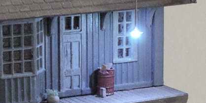 Here we've used our tubing, 18" N-Scale lampshade and escutcheon, and a Micro Super-white LED to make a "gooseneck" building entry light. This style of lighting fixture has been around since the 1920s and is still being manufactured today. It certainly draws attention to an otherwise mundane service door at the rear of this building.