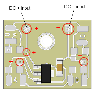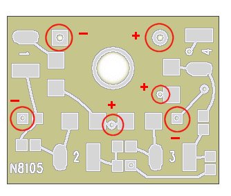 Powering Simulators from the Side A of the board In certain situations, it may be convenient to use the LED Power Distribution Jr. as a connection point for power for our Lighting Effects Simulator products. Our Lighting Effects Simulators have their own voltage regulators on-board, so they can be directly connected to the N8105 whether it is being used with our N3512 12-volt, or our N3518 18-volt Power Supply. All that is required is connection of the + and – DC power wires from the Simulator(s) be connected to the + and – voltage rails on the Power Distribution Board. There are many points where wires can be attached. Figure 1 below shows several of those locations circled in red.