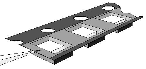 Many of our products are packaged in a protective carrier strip. Some items are sensitive to static electricity and the carrier is a black plastic material designed to help protect against static discharge. Other carrier strips can be clear plastic or a pressed paper strip. The sketch below is an example of a typical anti-static carrier strip..