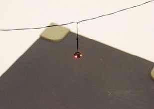 Note: Video files require time to download, please be patient. The photos below are of our little N-scale intersection diorama. Hanging above the intersection is a traffic signal (4 LEDs wired in series) with 2 yellows for Caution and 2 reds for Stop. The 4-LED signal is powered by our N8012 Signal Flasher. Just click on either photo to run a video of the signal in operation.