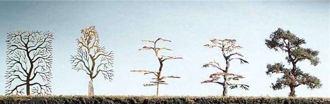 Flocking: (typically, ground foam) AMSI or Woodland Scenics products are available in most hobby shops. The AMSI foam is ground a bit finer. Both are good and have a decent variety of colors. Etched Foliage: Check out our Etched Foliage products here or select it from the Photo-etched Products page. Adding this product to our larger tree frames (such as the NS041) will produce dramatic realism. These products are also excellent to improve plastic tree armatures and those made from wood cuttings. |