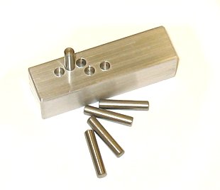 The first step in building this gooseneck light is to flare the end of a segment of the .018” tubing. The complete procedure for doing this can be found here (under cold flaring). Once the tubing has been flared, the next step is forming the gooseneck shape and that is where this tool is used. Following is the step-by-step procedure: Bending the tubing The tool (pictured below) consists of an aluminum block which contains 5 holes, and 5 .125" diameter pins which fit into the holes. The holes are located in a pattern that with pins inserted, provide a bending pattern that the .018" tubing can be formed around to achieve the gooseneck shape.