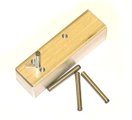 The first step in building this gooseneck light is to flare the end of a segment of the .018” tubing. The complete procedure for doing this can be found here (under cold flaring). Once the tubing has been flared, the next step is forming the gooseneck shape and that is where this tool is used. Following is the step-by-step procedure: Bending the tubing The tool (pictured below) consists of an aluminum block which contains 5 holes, and 5 brass pins which fit into the holes. The holes are located in a pattern that with pins inserted, provide a bending pattern that the .018" tubing can be formed around to achieve the gooseneck shape.